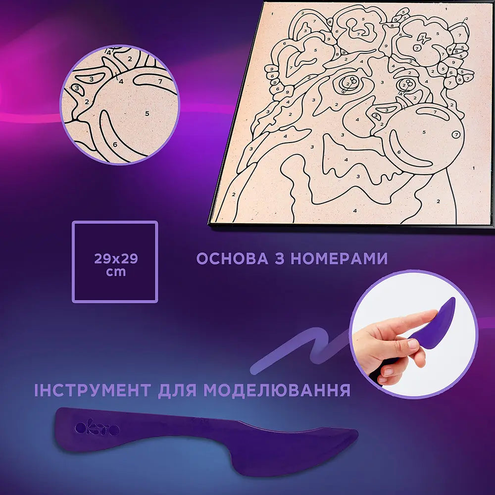 Набір створений спеціально для дітей, аби вони без сторонньої допомоги змогли завершити власний шедевр і зміцнити віру у свої творчі здібності. Завдяки зрозумілій нумерації та приємній на дотик глині процес буде легким навіть для початківців.