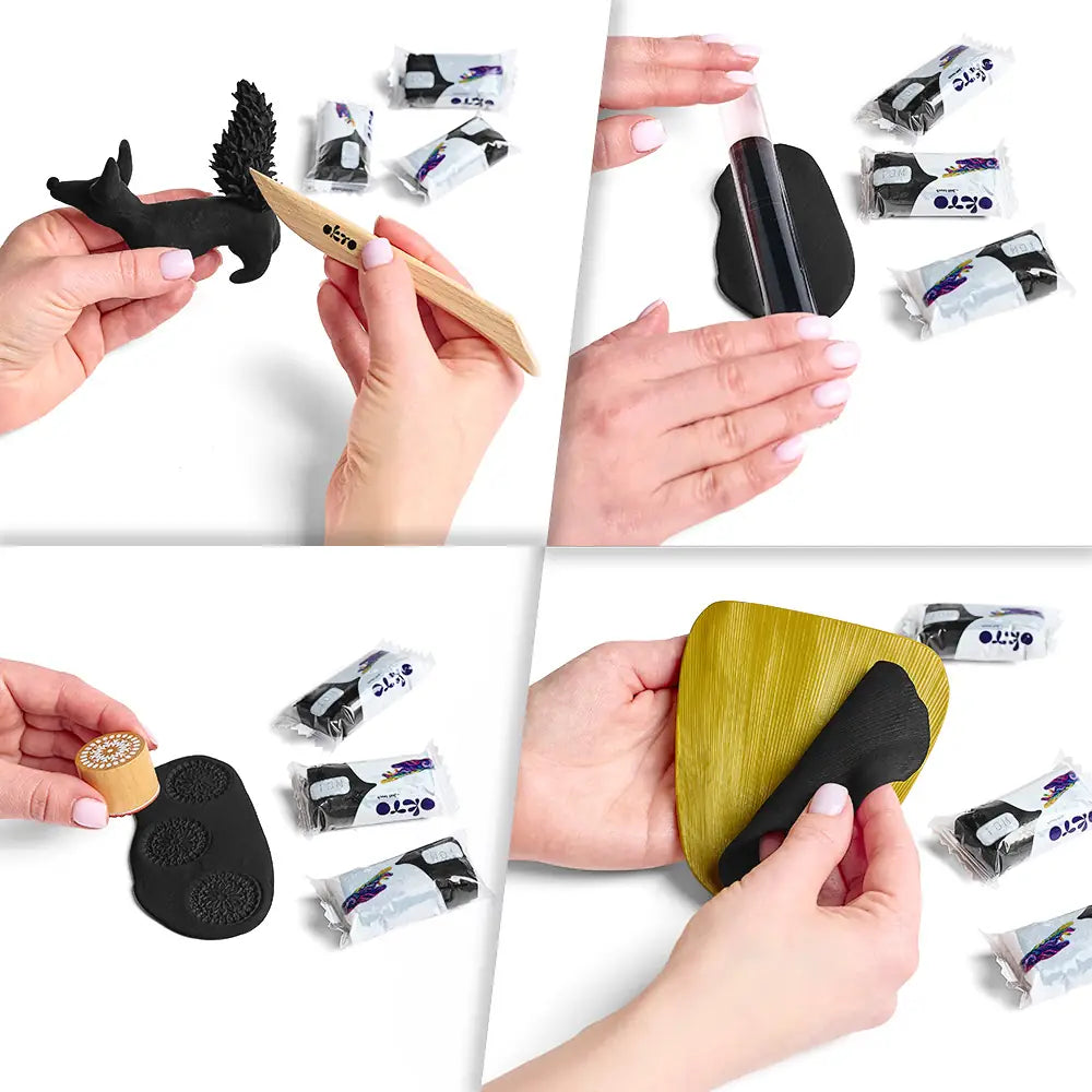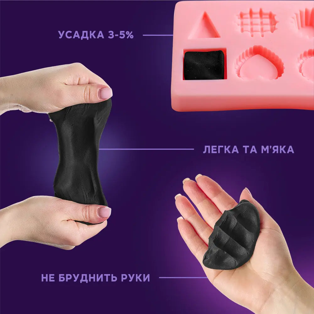 Щоб зберегти еластичність, після роботи покладіть невикористані шматочки назад у пакет, видаливши зайве повітря. Для глянцевого ефекту використайте прозорий акриловий лак після повного висихання виробу. Комбінуйте чорний пластилін з яскравими відтінками з нашої палітри і створюйте складні колірні градієнти.