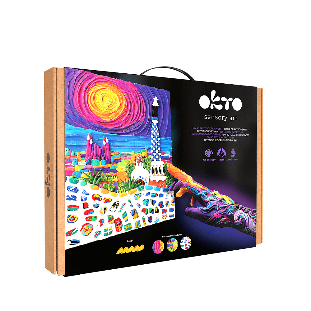 Так, сенсорне мистецтво OKTO рекомендоване Асоціацією арт-терапії як інструмент для покращення психологічного здоров'я, релаксації та творчого розвитку. Арт-терапевти рекомендують наші набори як чудовий спосіб зменшити стрес, заспокоїти розум, покращити концентрацію та заохотити усвідомленість. Вони допомагають розвивати дрібну моторику, яка необхідна для розвитку мовлення та інтелекту. Водночас вони допомагають дітям зосередитися та підтримувати їхню увагу у веселій та грайливій формі.