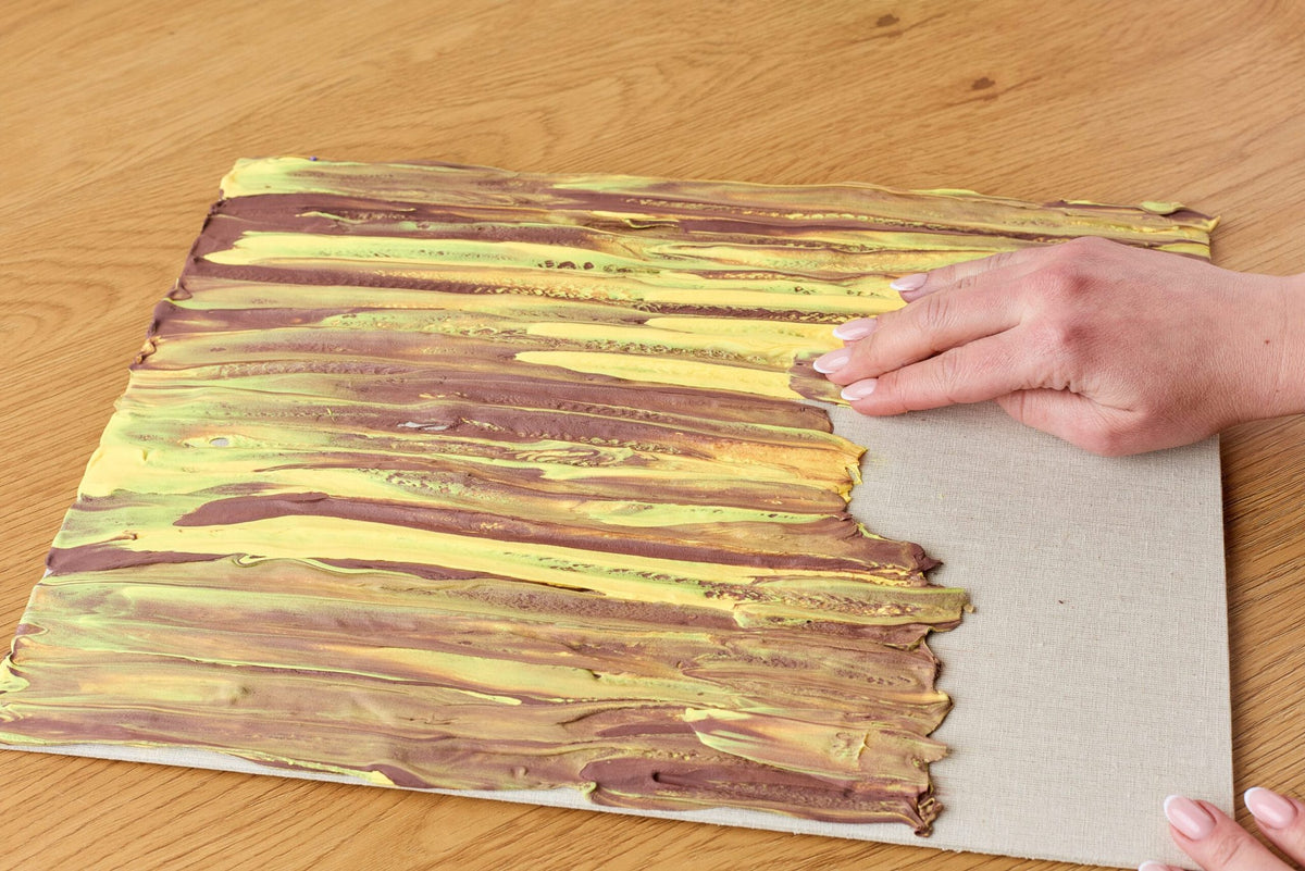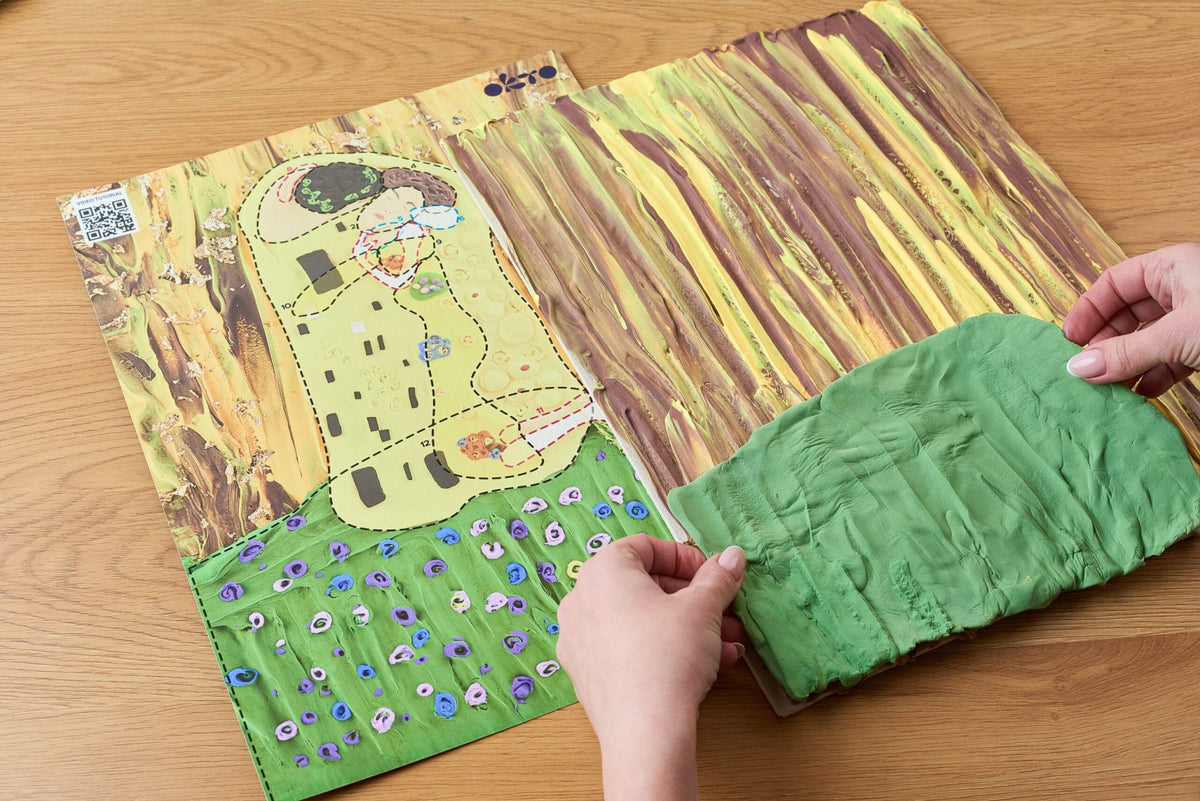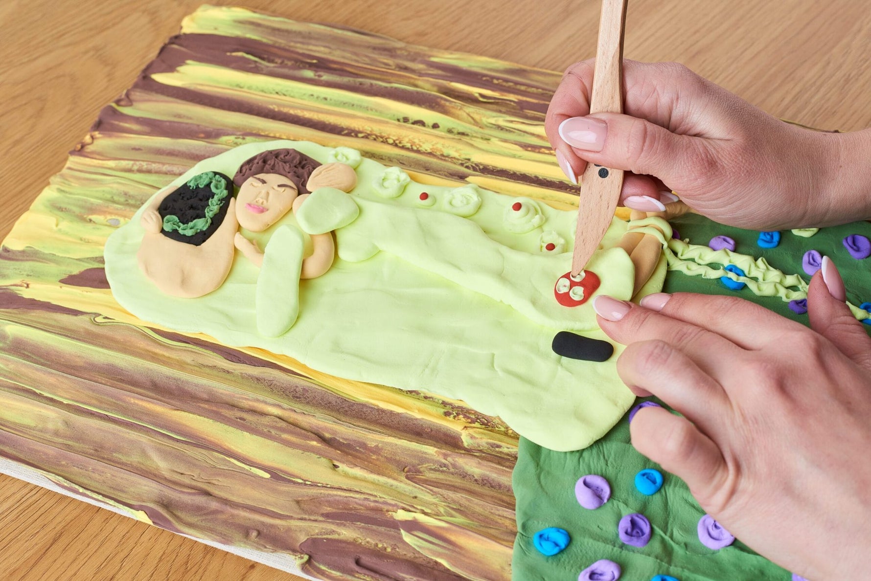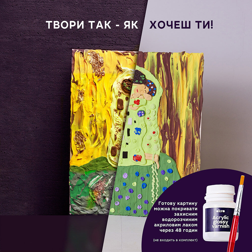 Вибирай колір, з якого хочеш почати, набирай глину пальцями та сміливо нанось на полотно. Створи свій фон, а потім ліпи по шаблону і перенось частини картини на основу. Відчуй, як під твоєю рукою народжується мистецтво.