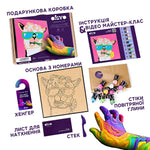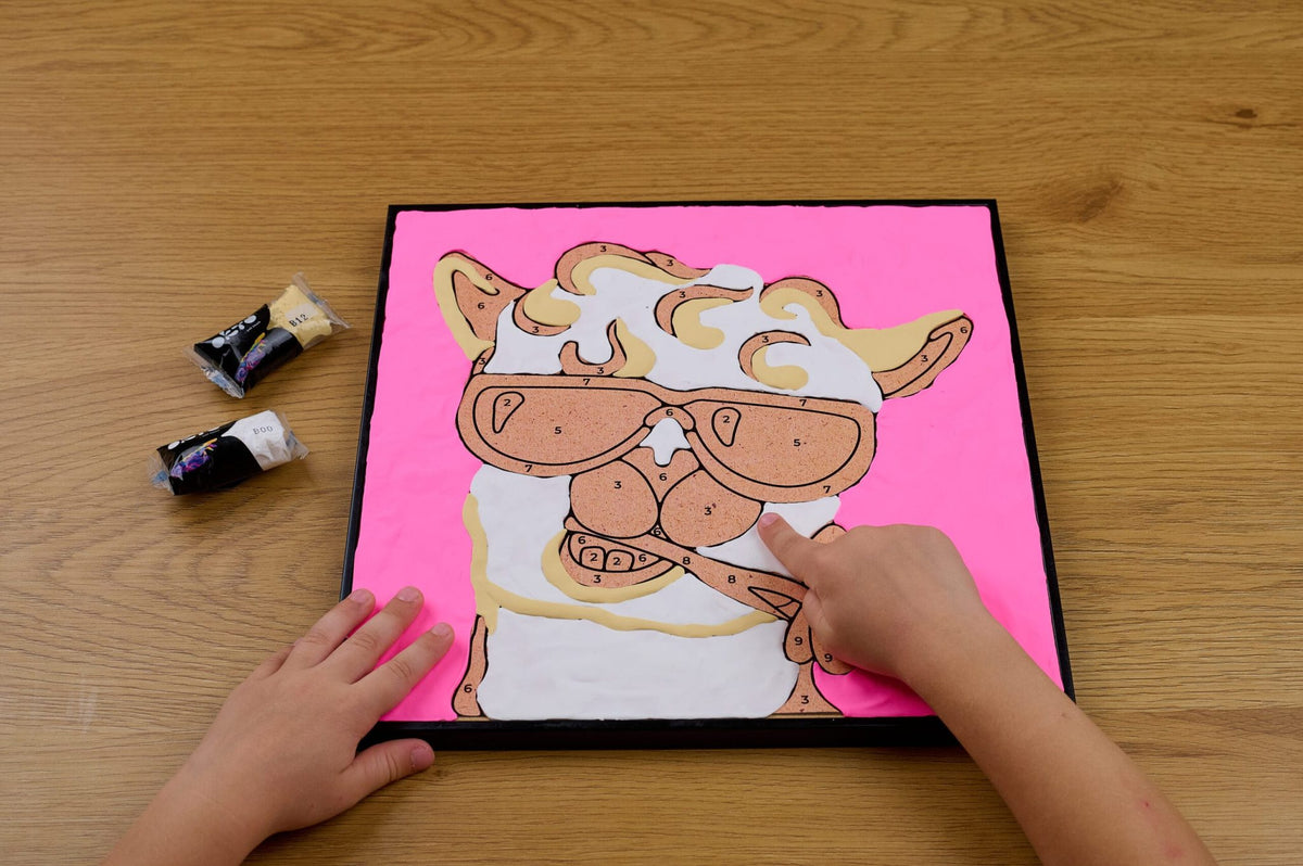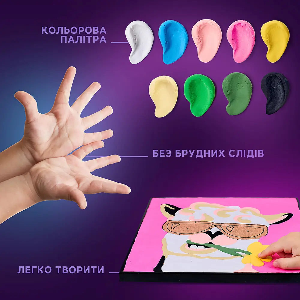 Вибирай колір, з якого хочеш почати, набирай глину пальцями та сміливо нанось на полотно. Створи свій фон, а потім ліпи по шаблону і перенось частини картини на основу. Відчуй, як під твоєю рукою народжується мистецтво.